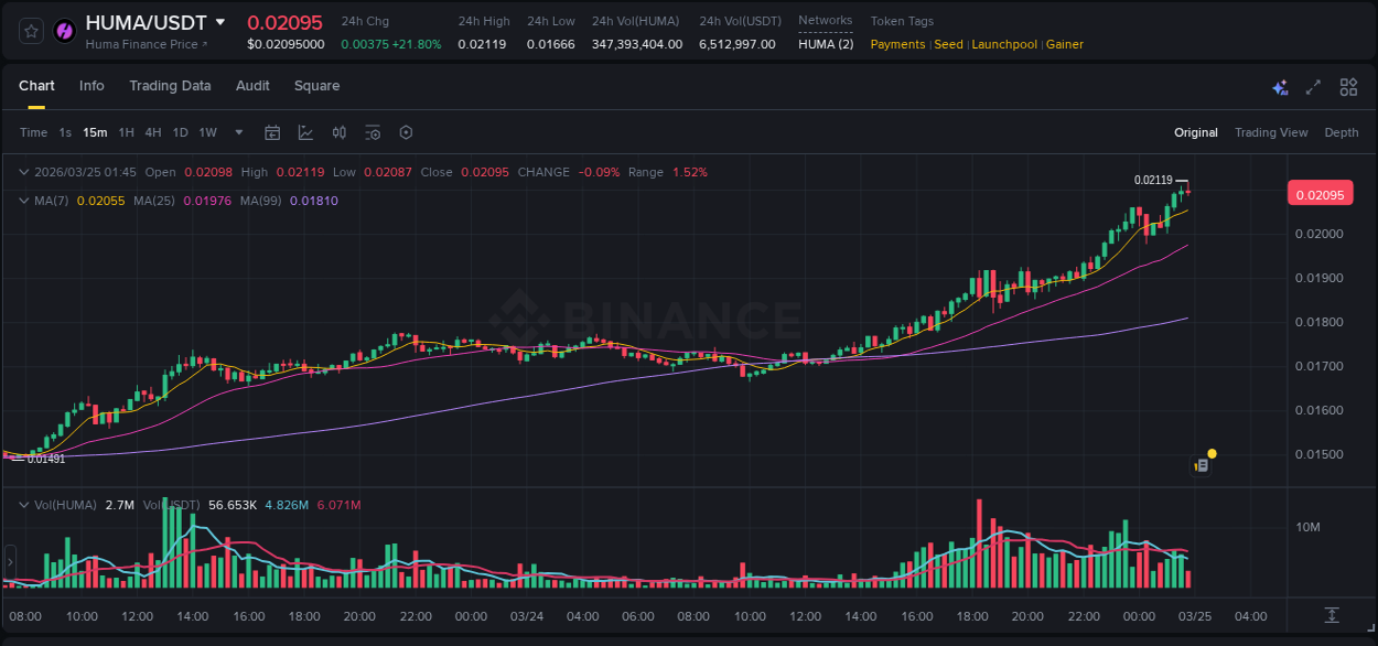 Asset #HUMA/USDT (Binance) reached 15.1% probability target