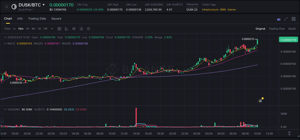 ✍️ Entry into #DUSKBTC at the price of 0.00000119 BTC occurred when the overall market conditions on the 5-minute timeframe became fully favorable for long positions.